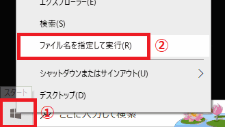 デスクトップ画面の左下のWindowsスタートボタンを右クリックし、「ファイル名を指定して実行」を選択します。