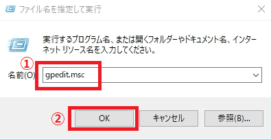 「gpedit.msc」を入力し、[OK]を押下すると、ローカルグループポリシーエディターが起動します