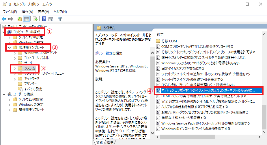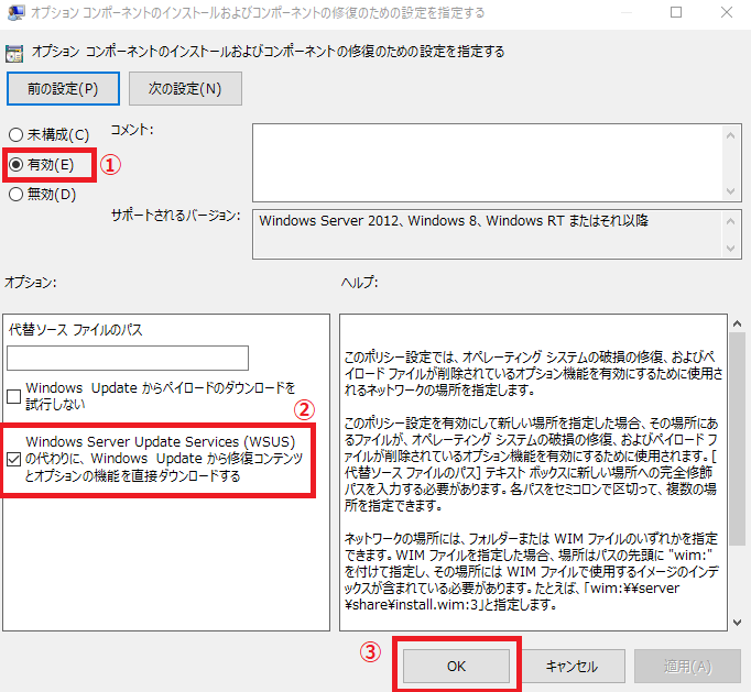 ・ オプションコンポーネントのインストールおよびコンポーネントの修復のための設定を指定する → 有効